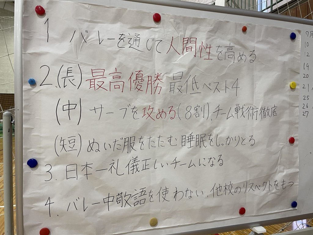 体育館の隅にあるホワイトボードには、練習メニューと裏面には選手たちが考えた目標が貼られていました。