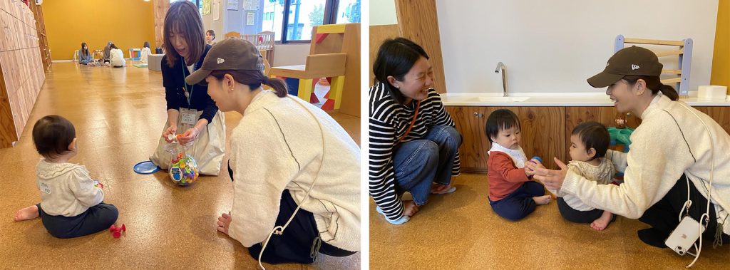 ▲左:おもしろい玩具がたくさん!「こうやって遊ぶんだよ~!」と楽しい遊び方も教えてくれます♪ 右:遊びの中からママ達の交流と笑顔が自然とあふれてきます♡