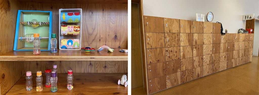 ▲左:保育士さん達手作りの玩具に心もほっこり♡ 右:鍵付きロッカーは荷物の多いママ達に助かります
