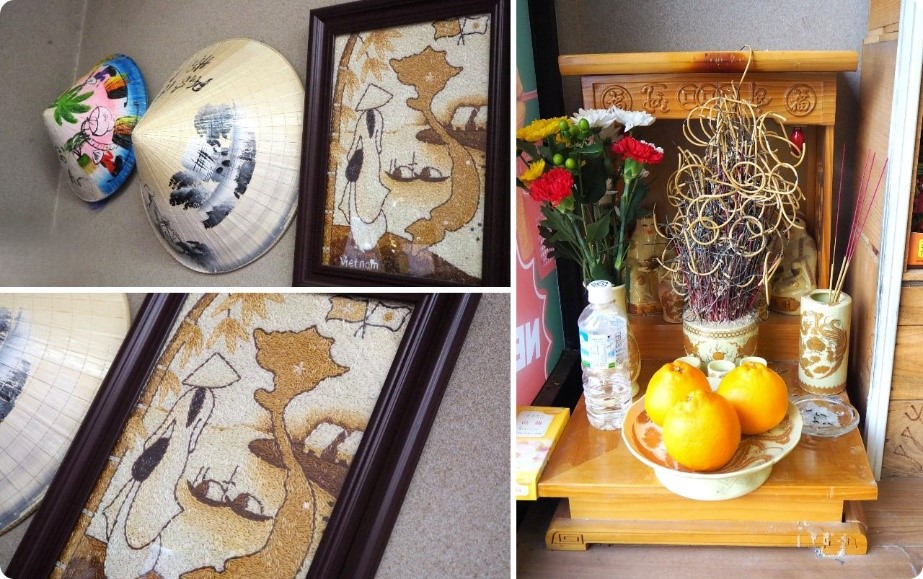 ▲店内にはベトナムのノンラー(麦わら帽子)や米絵(ライスピクチャー)など伝統工芸品が飾られている他、ベトナムのお店によくある神棚も入り口でお客さまをお出迎え。